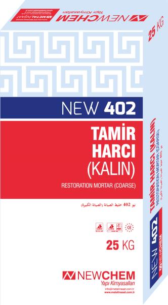 *Uygulanacak yüzey yağ, kir, toz ve gevşek parçalardan arındırılmalıdır. *Uygulama yapılacak yüzey uygulamadan önce nemlendirilmelidir. *Her türlü inşaat tamirinde ve inşaat esnasında betonarmede oluşan boşlukların doldurulmasında, brüt beton yüzeylerin tamirinde, betonarme ve kalıptan kaynaklanan bozuk yüzeylerin tamirinde, kenar köşe tamirinde kullanılır. *1 Torba NEW 402 Tamir Harcı (Kalın) 4,0-5,0 litre su ile karıştırıcı yardımıyla homojen olarak karıştırılır ve karışım 5 dakika bekletildikten sonra 2 dakika daha tekrar karıştırılarak uygulanır. Verilen bu şartlar hava sıcaklığına ve uygulamaya göre değişebilir. *Uygulanabilecek kat kalınlığı maximum 10 mm (tek seferde) *Katlar arası beklenmesi gereken süre: Ortalama 3 saat *5-30 mm kalınlığa kadar uygulanabilir. *Kullanma süresi geçmiş harç su ile karıştırılıp tekrar kullanılmamalıdır.