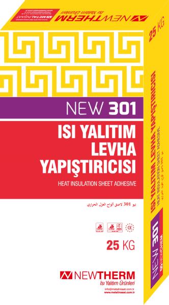 *Uygulanacak yüzey, yağ, kir, toz ve gevşek parçalardan arındırılmalıdır. *Karışım yapılacak temiz bir kaba 6,0-6,5 litre su konulur. Bir torba NEW 301/Isı Yalıtım Levha Harcı karıştırıcı yardımıyla karıştırılarak suya yavaş yavaş ilave edilir. Karışım tamamen karışıp homojen hale gelinceye kadar karıştırmaya devam edilir. Karıştırma işlemi tamamlandıktan sonra 5 dakika beklenilir. Sonra tekrar karıştırılarak ürün uygulamaya hazır hale getirilir. *Yapıştırma harcı, Isı yalıtım levhasının çevresine şerit halinde ve levhanın orta bölümüne öbek olarak uygulanır. Kuvvet uygulanarak ısı yalıtım levhası yüzeye yapıştırılır. *Uygulama +5⁰C +35⁰C arası sıcaklıkta yapılması önerilir. *Kullanma süresi geçirilmiş harç su ile karıştırılıp tekrar kullanılmamalıdır. *Uygulama ile ilgili teknik sorularınız için lütfen bize danışınız.