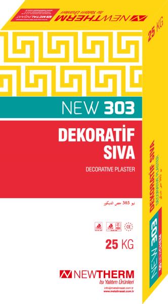 *Uygulanacak yüzey yağ, kir, toz ve gevşek parçalardan arındırılmalıdır. * Yüzeyde Çatlak ve oyuklar var ise NEW 401-402/İnce-Kalın Tamir harcı ile tamir edilir. * Karışım yapılacak temiz bir kaba 5,5-6,5 litre su konulur. Bir torba NEW 303 Dekoratif Sıva karıştırıcı yardımıyla karıştırılarak suya yavaş yavaş ilave edilir. Karışım tamamen karışıp homojen hale gelinceye kadar karıştırılmaya devam edilir. Karıştırılma işlemi tamamlandıktan sonra 5 dakika beklenir. Sonra tekrar karıştırılarak ürün uygulamaya hazır hale getirilir. *İyice karışmış olan malzeme, paslanmaz çelik mala ile duvara uygulanır. Desen verme işlemi plastik bir mala ile yapılmalıdır. *NEW 303 Dekoratif Sıva tek kat uygulanır. *Uygulama + 5⁰ C + 35⁰ C arası sıcaklıkta yapılması önerilir. Kullanma süresi geçirilmiş harç su ile karıştırılıp tekrar kullanılmamalıdır. *Uygulama ile ilgili teknik sorularınız için lütfen bize danışınız.